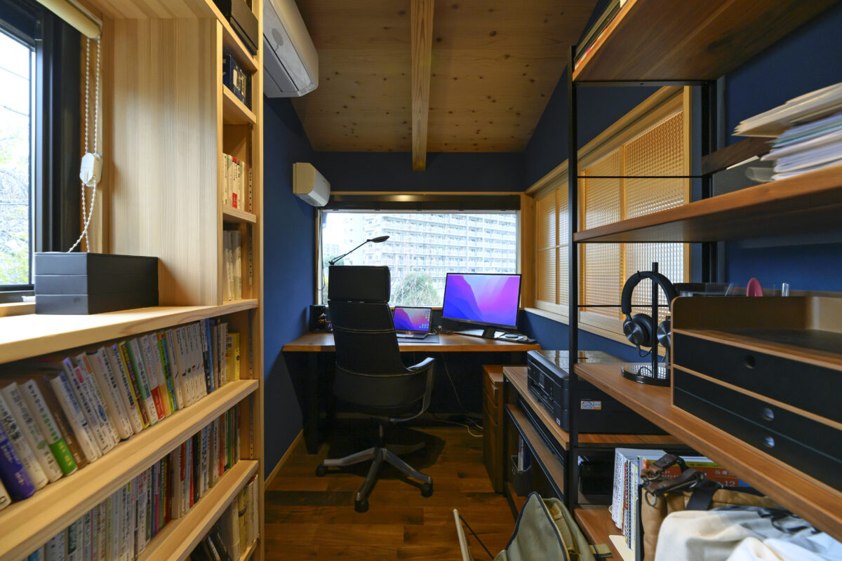 階段を上がった先には、家族との繋がりを感じられながらも、集中できるような書斎を設けました。 在宅ワークが増えた現代にとって欠かせない空間です。
